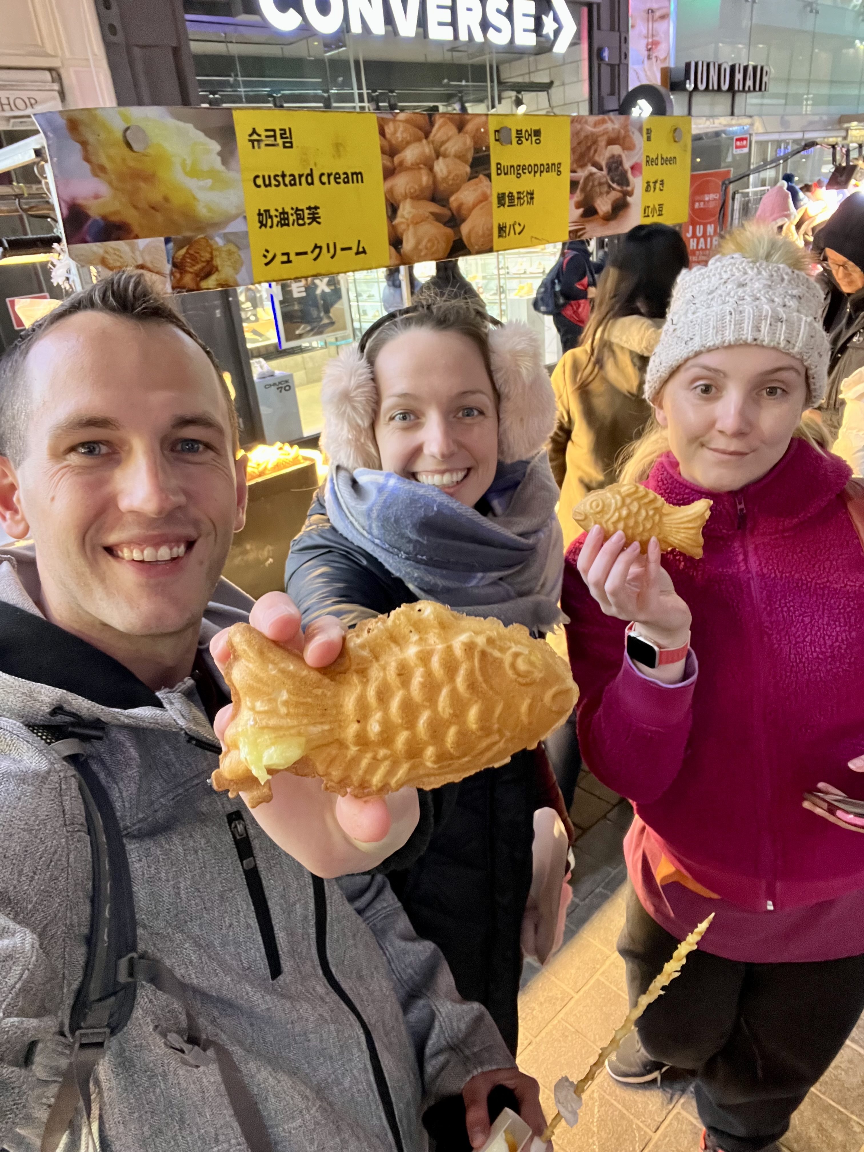 One of our favorite things about Seoul was Myeongdong Street at night time, because this is where food dreams come to life. We ended up coming back here our second, last night as well because we loved it so much. Everything we ate was delicious and I totally recommend, including-Korean hotteok pancake (tasted like fried donut dough) filled with sugar, honey, peanuts, and cinnamon, best served pipping hot.